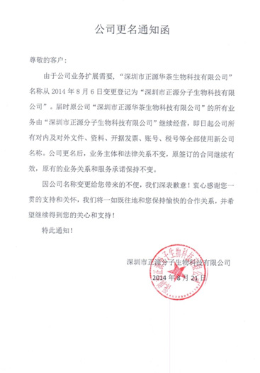 由于公司業(yè)務拓展需要,“深圳市正源華茶生物科技有限公司”名稱從2014年8月6日變更登記為“深圳市正源分子生物科技有限公司”。特此通知,詳情請瀏覽圖片內(nèi)容。