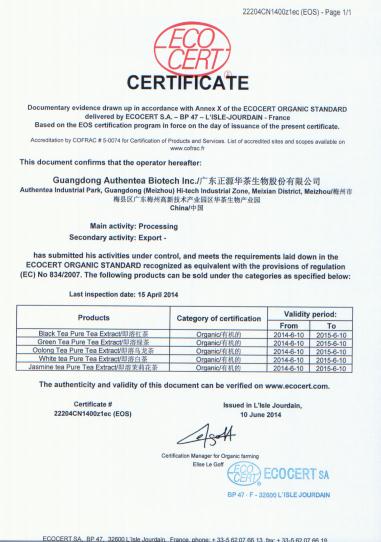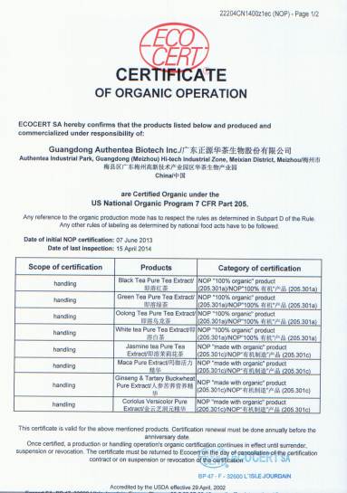 近日獲悉,廣東華茶生物股份有限公司旗下兩大品牌珍稀滋補(bǔ)精華“集珍源”與快時(shí)尚即溶茶“樂(lè)淳”的產(chǎn)品均獲得了美國(guó)農(nóng)業(yè)局(USDA)頒發(fā)的國(guó)家有機(jī)工程N(yùn)OP(The National Organic Program)頒發(fā)的100% Organic(有機(jī))認(rèn)證以及歐盟ECOCERT有機(jī)認(rèn)證頒發(fā)的有機(jī)產(chǎn)品認(rèn)證證書(shū)。這標(biāo)志著,華茶生物的產(chǎn)品,從原材料到成品,都完全符合美國(guó)農(nóng)業(yè)局、歐盟、日本農(nóng)林水產(chǎn)省、中國(guó)農(nóng)業(yè)部的規(guī)格標(biāo)準(zhǔn),也同樣說(shuō)明了,華茶生物的產(chǎn)品,是無(wú)農(nóng)殘、無(wú)添加、無(wú)污染,完全的天然健康并且環(huán)保的,華茶生物革命性的工程技術(shù)為全球消費(fèi)者帶來(lái)了更健康的選擇。