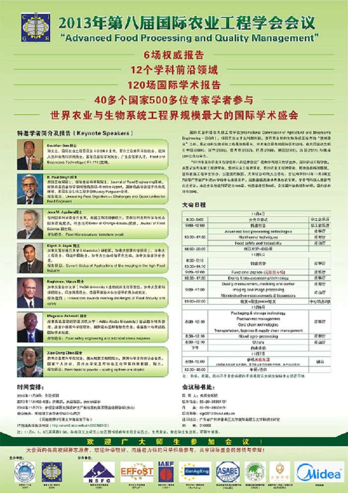 “2013年國(guó)際農(nóng)業(yè)工程學(xué)會(huì)第八屆技術(shù)會(huì)議”將于11月3日至7日在廣東省廣州市召開,世界各地的專家、學(xué)者與科技人員將參加此次會(huì)議。會(huì)議由華南理工大學(xué)主辦, 國(guó)際農(nóng)業(yè)工程學(xué)會(huì),美國(guó)農(nóng)業(yè)與生物工程師學(xué)會(huì),亞洲農(nóng)業(yè)工程師學(xué)會(huì), 歐洲農(nóng)業(yè)工程師學(xué)會(huì),歐洲食品科技聯(lián)盟,國(guó)際食品工程學(xué)會(huì)協(xié)辦,以及正源華茶等企業(yè)的大力贊助。